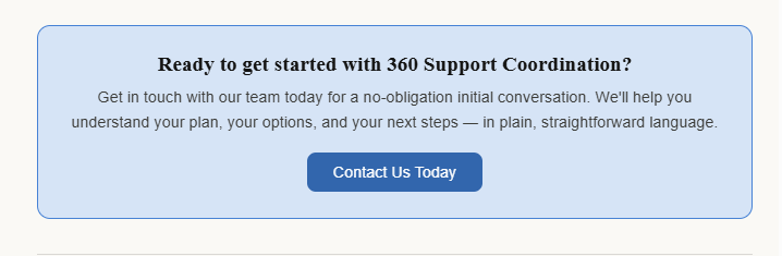 If your plan includes Support Coordination funding, reach out to a registered support coordination provider as soon as possible. The sooner you engage a coordinator, the sooner you can start accessing the services your plan funds. At 360 Support Coordination, we offer an initial consultation to help new participants get their bearings before any formal engagement begins.