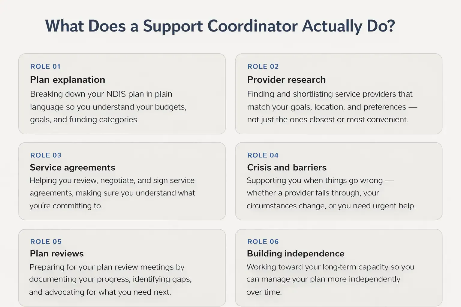 This is one of the most common questions new participants ask — and for good reason. The role of a support coordinator is practical, personalised, and participant-focused. Here is what working with a support coordinator typically looks like: