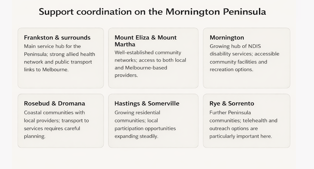 For participants across Melbourne's south-east and the Mornington Peninsula, the local landscape has its own character. It combines the strengths of close-knit regional communities with a growing network of allied health, therapy, and disability services — but it also has its challenges. Transport limitations, geographic spread, and uneven service availability all affect how participants access support. A coordinator who works in this region every day knows these realities firsthand. One who coordinates from a distance does not.